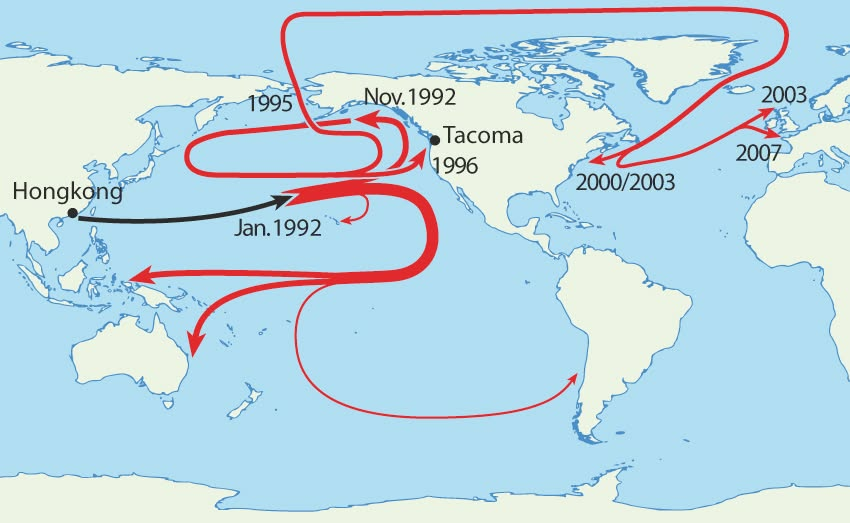 Cała historia zaczyna się w roku 1992. Dokładniej 10 stycznia tegoż roku. Sztorm. Ze statku “Ever Laurel” woda zmywa 12 kontenerów. W jednym z nich znajduje się 29 tys. gumowych zabawek marki Friendly Floatees. Zabawki wyprodukowano w Chinach. Transportowane były na zlecenie amerykańskiej firmy The First Years. I okazało się, że znaczną część z nich stanowiły żółte gumowe kaczuszki. Po zniknięciu z pokładu statku kaczuszki rozpłynęły się w różnych kierunkach, spójrzmy na tę mapkę: